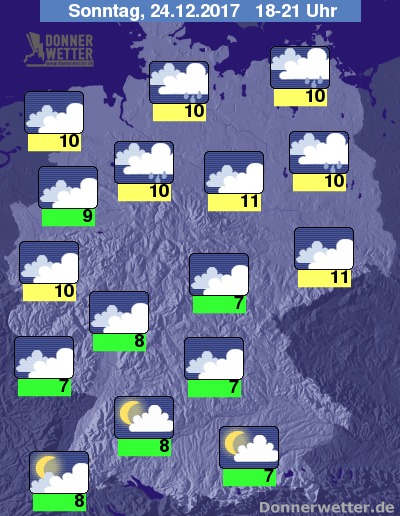 Zum Heiligen Abend fällt im Norden bei einer geschlossenen Wolkendecke zeitweise Regen. Dichte Wolken halten sich auch über der breiten Landesmitte, wobei es hier meist trocken bleibt. Im Süden ist es auch oft locker bis aufgelockert bewölkt, dazu bleibt es trocken. Die Temperatur liegt bei 7 bis 11 Grad.