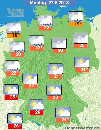 Am Montag zeigt sich das Wetter im Süden verbreitet heiter bis sonnig und trocken, über die Nordhälfte ziehen dagegen häufig dichte Wolken hinweg, dabei bilden sich gebietsweise Schauer, zum Teil zeigen sich Aufheiterungen. Die Temperatur steigt auf nur 19 Grad an den Küsten und bis 26 Grad am Oberrhein.
