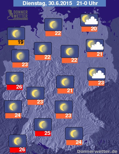 Heute Abend können im äußeren Osten und Nordosten einige lockere Wolkenfelder durchziehen, im großen Rest der Bundesrepublik zeigt sich jedoch ein durchweg sternenklarer Abendhimmel. Es bleibt überall trocken bei Werten zwischen 26 Grad in Freiburg und um 19 Grad im nördlichen Emsland.