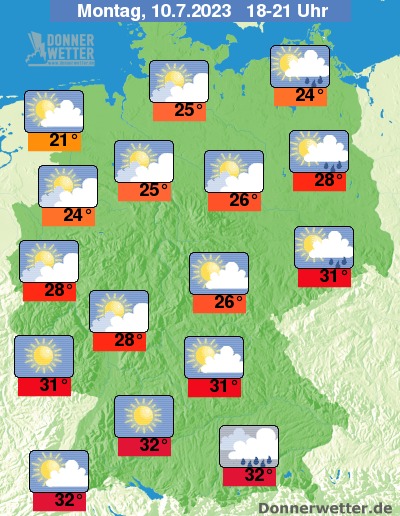 Heute Abend sind lediglich am Alpenrand und in den östlichsten Landesteilen einzelne Schauer und Gewitter möglich. Im übrigen Bundesgebiet ist es meist heiter bis sonnig. Vor allem vom Niederrhein bis an die Nordsee sind auch mehr Wolken möglich, dazu bleibt es aber trocken. Die Temperatur liegt bei 21 Grad in Cuxhaven und bis 32 Grad in Stuttgart.