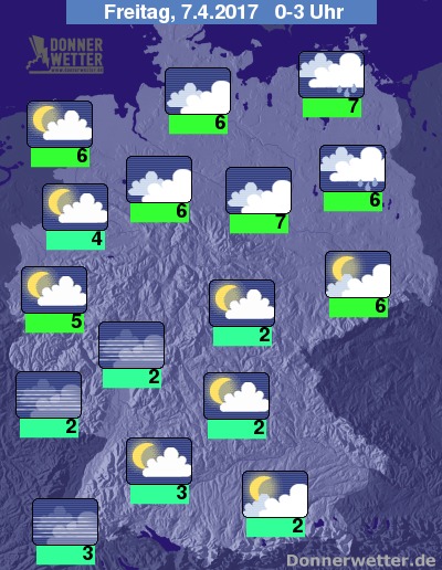In der Nacht auf Freitag bleibt der Himmel im Nordosten meist bedeckt, zudem können hier einzelne Schauer fallen. Im restlichen Bundesgebiet bleibt es bei teils lockerer Bewölkung, teils örtlichem Nebel meist trocken. Die Temperaturen liegen nun bei Werten um 7 bis 2 Grad C.