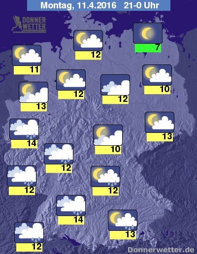 Heute Abend bleibt es im Nordosten sternenklar, über der übrigen Nordosthälfte ist es meist locker oder aufgelockert bewölkt und dazu trocken. Im Südwesten halten sich bereits meist dichte Wolken aus denen sich einzelne Schauer entwickeln können, bis Mitternacht ziehen die Schauerwolken auch in den Süden und Westen Deutschlands. Die Abendtemperatur liegt bei 14 Grad im Rheinland und etwa 7 Grad an der Müritz.