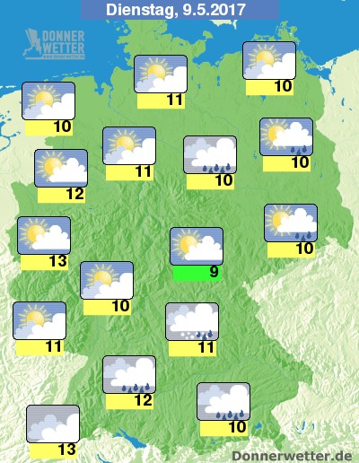 Am Dienstag zeigt sich das Wetter über der Osthälfte überwiegend stark, zum Teil aber auch aufgelockert bewölkt, jedoch können sich einzelne Schauer bilden. Am freundlichsten ist es im Westen des Landes bei weitgehend heiterem bis sonnigem Himmel, sonst ist es wechselnd bis aufgelockert bewölkt und trocken. Die Temperatur steigt auf 9 bis 13 Grad.