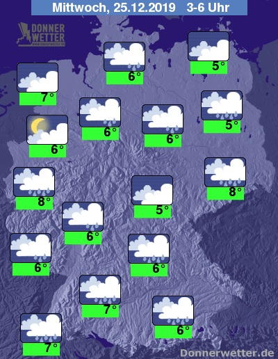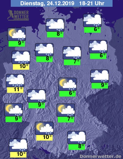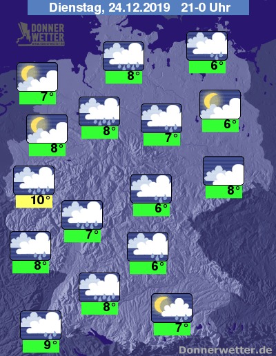 Während der Bescherungszeit fällt im Nordosten aus kompakten Schichtwolken zeitweise leichter Regen oder Sprühregen. In den anderen Gebieten blinzeln durch kleinere Lücken auch mal Sterne hervor. Sonst muss auch hier immer wieder mit Regenfällen oder Schauern gerechnet werden.