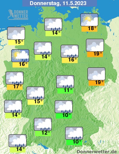 Am Donnerstag zeigt sich das Wetter meist stark bis dicht, vor allem im Nordosten aber auch aufgelockert bewölkt. Es bilden sich immer wieder, zum Teil auch kräftige Schauer. Die Temperatur erreicht nur 10 Grad in München und bis 19 Grad in Berlin.