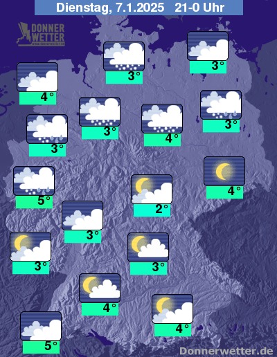In der Nacht zum Mittwoch sind in der Nordhälfte noch einzelne Schneeregen- oder Schneeschauer möglich, im weiteren Verlauf nachlassend. Südlich des Mains kommen in den frühen Morgenstunden neue Regen- oder Schneefälle auf, lokal besteht Glättegefahr!