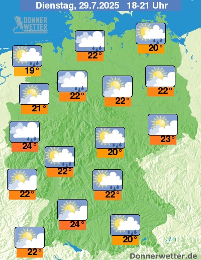 Am Mittwoch ist es über dem Norden meist stark bewölkt oder bedeckt und es bilden sich oft Schauer. Im übrigen Bundesgebiet ist es zum Teil heiter, teils ziehen jedoch ebenfalls dichte Wolken durch, dabei bilden sich gebietsweise Schauer. Die Temperatur erreicht 18 Grad in Wilhelmshaven und bis 24 Grad in Bonn.