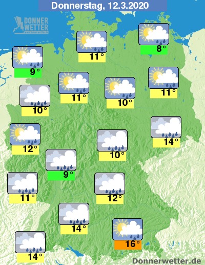 Die Höchsttemperaturen liegen allgemein zwischen 8 und 12 Grad. Vor der Front können im Osten und Süden auch 12 bis 16 Grad erreicht werden.