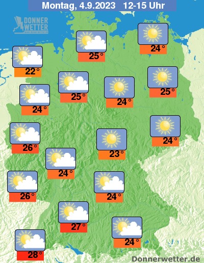 Heute Nachmittag zeigt sich das Bundesgebiet verbreitet heiter bis sonnig, über der Osthälfte ist es zum Großteil wolkenlos. Bei Werten von 22 Grad an der Nordsee und 28 Grad am Oberrhein bleibt es trocken.