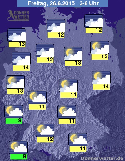 In der kommenden Nacht ist es über der Südhälfte Deutschlands meist locker oder aufgelockert bewölkt, nach Norden hin ist es hingegen verbreitet stark und nur zum Teil auch aufgelockert bewölkt, jedoch bleibt es überall trocken. Die Temperatur sinkt auf 14 Grad im Ruhrgebiet und bis 9 Grad am Fuße des Schwarzwaldes.