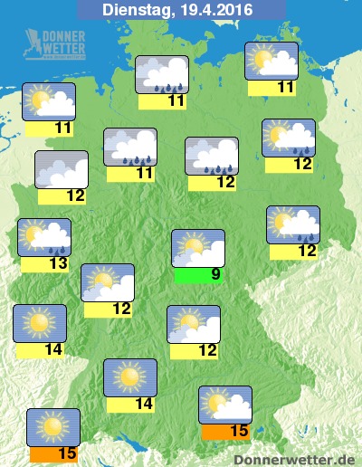 Heute ist es über dem Süden Deutschlands weitgehend heiter bis sonnig und dazu trocken, in den anderen Landesteilen, besonders über der breiten Mitte ziehen jedoch dichte Wolken und es fällt gebietsweise Regen. Im Norden ist es wechselnd und nur zum Teil stark bewölkt, dabei ist jedoch ebenso Regen möglich. Die Temperatur steigt auf kühle 9 Grad im Vogtland und bis 15 Grad in Konstanz.