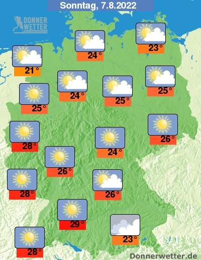 Am Sonntag ist es im Norden und am Alpenrand gebietsweise stark bewölkt, im übrigen Land zeigt sich das Wetter heiter bis sonnig. Es bleibt landesweit trocken bei Werten von 21 Grad im nördlichen Emsland und bis 29 Grad in Schwaben.