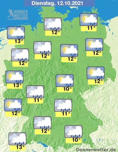 In der Nacht zum Dienstag zeigt sich der Himmel überwiegend stark bewölkt, vor allem in der ersten Nachthälfte ist es noch vielerorts locker bis aufgelockert bewölkt. Von Nordwesten her ziehen jedoch Schauer herein, die bis zum Morgen auch die breite Landesmitte erreichen. Im Süden bleibt es jedoch weitgehend trocken. Die Temperatur sinkt auf 10 Grad in Bremerhaven und bis 4 Grad in Jena. An den Küsten weht ein starker bis stürmischer Wind.