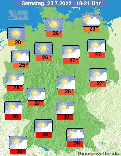 Heute Abend ist es über dem Norden meist heiter bis sonnig, sonst ist es verbreitet locker bis aufgelockert, hier und da auch mal stärker bewölkt, jedoch trocken. An den Alpen sind unter teils dichten Wolken allerdings einzelne Schauer und Gewitter möglich. Die Temperatur liegt bei 20 Grad in Bremerhaven und rund 30 Grad in Stuttgart.