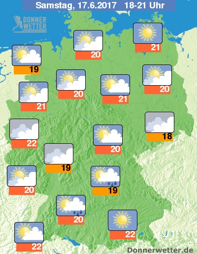 Heute Abend zeigt sich besonders der Norden meist heiter und trocken, weiter nach Süden ist es teils stark, teils wechselnd bewölkt, dazu sind aber nur noch seltene Schauer möglich. Im Süden ist es auch oft sonnig. Die Temperatur liegt bei 18 bis 22 Grad.