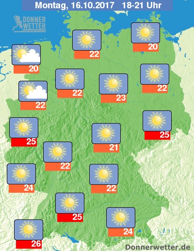 Heute Nachmittag strahlt die Sonne über dem Großteil der Bundesrepublik ungestört vom Himmel. Lockere Wolkenfelder ziehen vor allem über den Nordwesten des Landes hinweg. Es bleibt überall trocken bei Werten zwischen 19 Grad an der Nordsee und bis 25 Grad im Oberrheingraben.