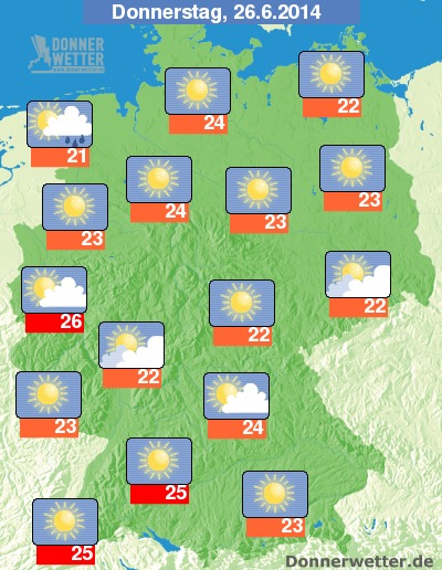 Offensichtlich ist Petrus ein Deutschland-Fan, denn ausgerechnet am heutigen Donnerstag zeigt sich das Wetter von seiner besten Seite und es ziehen nur selten dichtere Wolken durch. Dabei können sich die Fans am frühen Abend auf bestes Public-Viewing Wetter einstellen. Nur im Emsland und am Bayerischen Wald besteht ein leichtes Schauerrisiko, sonst steht einem tollen Fussballabend aber nichts im Wege.