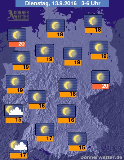 In der kommenden Nacht zeigt sich der Himmel über der Republik weitestgehend sternenklar, nur rund um den Schwarzwald sind örtlich dichte Quellwolken und vereinzelte Schauer und Gewitter möglich, sonst bleibt es trocken. Die Temperatur sinkt auf 20 Grad an der Nordsee und bis 15 Grad in München.