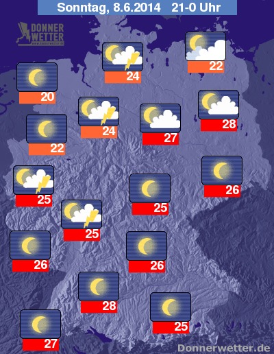 Am Abend können sich im Norden und Westen weiterhin teils kräftige Gewitter bilden, nach Südosten bleibt es dagegen ruhig und trocken bei teils drückenden Abendwerten von 28 bis 20 Grad.