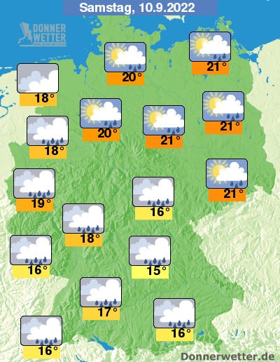 Am Samstag ziehen häufig dichte Wolken durch, teilweise können sich aber auch Auflockerungen zeigen. Es bilden sich allerdings wiederholt Schauer, örtlich entwickeln sich auch Gewitter. Die Temperatur steigt auf kühle 15 Grad in Nürnberg und bis 21 Grad in Berlin.