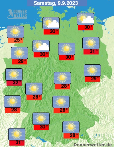 Heute scheint im gesamten Land die Sonne und es bleibt überwiegend wolkenlos. Lediglich im Norden können ein paar lockere Wolken durchziehen. Bei Höchstwerten von 25 Grad an der Nordsee und bis 32 Grad in der Kölner Bucht bleibt es bundesweit trocken.