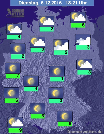 Heute Abend halten sich vom Norden bis Osten hin oft einige und zum Teil dichte Wolken, die aber keinen Niederschlag mehr bringen. Weiter nach Südwesten hin bleibt es dagegen weitestgehend sternenklar, dazu bleibt es trocken. Die Temperatur liegt bei 1 bis 9 Grad.