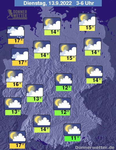 In der Nacht zum Dienstag bleibt der Himmel über dem Süden und über Sachsen meist gering bewölkt, sonst ziehen von Nordwesten her jedoch immer wieder einige, meist noch aufgelockerte Wolkenfelder durch. Im Norden zieht es sich bis zum Morgen mehr und mehr zu und vor allem im Nordseeumfeld fällt gebietsweise auch Regen. Die Temperatur sinkt auf 17 Grad an der Ems und bis 11 Grad im Berchtesgadener Land.
