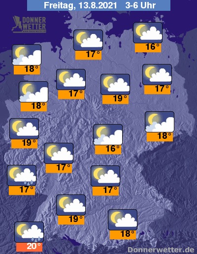 In der Nacht zum Freitag zeigt sich der Himmel überwiegend locker oder aufgelockert bewölkt, hier und da ziehen auch dichte Wolken durch, dazu sind im Südwesten des Landes und im Nordseeumfeld vereinzelt Schauer möglich, sonst bleibt es weitgehend trocken. Die Temperatur sinkt auf tropische 20 Grad in Freiburg und bis 16 Grad in Neubrandenburg.