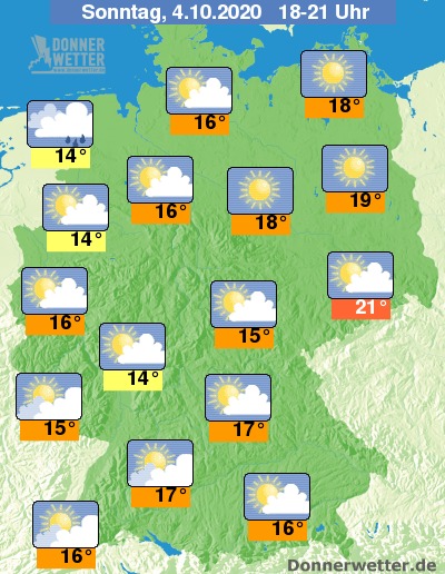 Heute Abend zeigt sich das Land verbreitet nur locker, nach Südwesten hin auch oft aufgelockert bewölkt. Zum Großteil ist es im Osten und Nordosten der Bundesrepublik heiter bis sonnig und trocken. Im Südwesten sind hier und da Schauer möglich, ansonsten bleibt es aber trocken bei 14 Grad an der Ems und bis zu 21 Grad in der Lausitz.