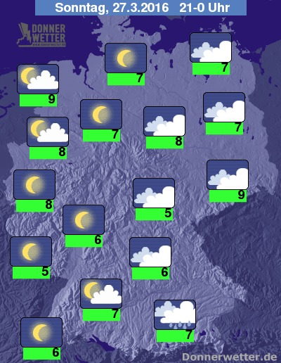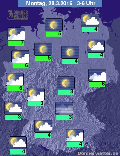 In der Nacht zum Ostermontag ist es zunächst in der Westhälfte noch meist sternenklar, hier ziehen jedoch von Westen her mehr und mehr Wolken auf und gegen Morgen setzt in den westlichen Landesteilen zum Teil kräftiger und langanhaltender Regen ein. Nach Osten hin ist es zunächst noch meist stark, teils aufgelockert bewölkt und im Laufe der Nacht zeigt sich der Himmel hier sternenklar oder nur locker bewölkt, dabei bleibt es trocken. Die Temperatur sinkt auf 7 Grad im Emsland und etwa 3 Grad in Mittelfranken. Im Westen und Nordwesten weht zum Morgen hin ein zunehmend starker bis stürmischer Wind, an der Nordsee herrscht auch Sturm.