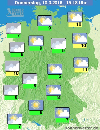 Am Samstag am Alpenrand und Erzgebirge teils dichte Wolken, meist trocken, sonst oft heiter oder wechselnd bewölkt, an der Nordsee meist starke Bewölkung, trocken, 6 bis 11 Grad.