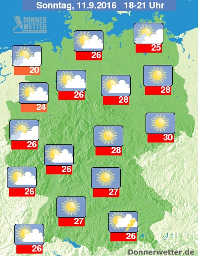 Heute Abend bleibt es über der Südosthälfte verbreitet sonnig und trocken, am Alpenrand sind jedoch hier und da auch mal dichte Wolken und einzelne Schauer und Gewitter möglich. Im Norden und Westen ist es meist aufgelockert, zum Teil auch nur locker bewölkt und dazu weitgehend trocken. Die Temperatur liegt bei 20 Grad in Emden und um 30 Grad in Dresden.