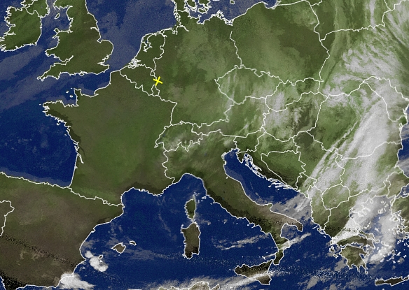 Das aktuelle Satellitenbild zeigt Wolkenfelder über Norddeutschland. Das Hoch über Westeuropa ist am Fehlen der hohen hellen Wolken gut zu erkennen.