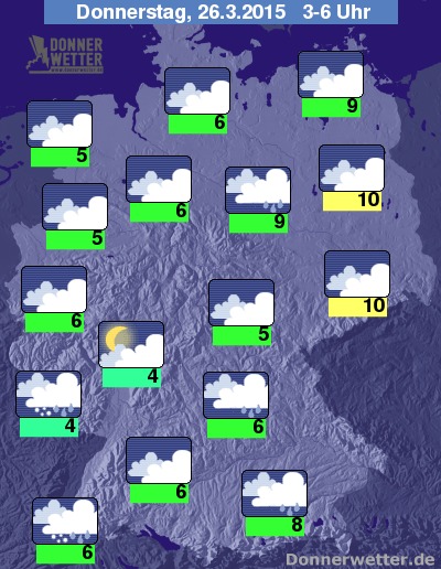 In der Nacht zum Donnerstag ist es zunächst bei starker Bewölkung noch verbreitet trocken und es fällt nur am Alpenrand sowie im Nordwesten gebietsweise Regen. Im weiteren Verlauf der Nacht werden die Wolken verbreitet dicht und sowohl im Süden als auch im Osten des Landes zieht zeitweiliger Regen auf. Nach Westen und Norden hin fällt nur vereinzelt etwas Regen oder Sprühregen. Die Temperatur sinkt auf 10 Grad in Berlin und bis 4 Grad in Saargau.