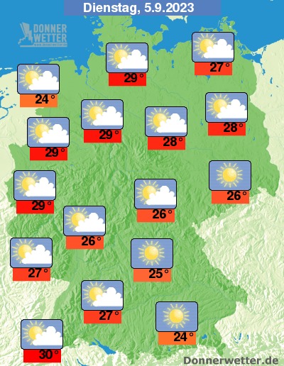 Am Dienstag scheint fast die ganze Zeit über die Sonne und es können nur lockere Wolkenfelder durchziehen, häufig ist es auch wolkenlos, dabei bleibt es trocken. Die Temperatur erreicht 24 Grad in Cuxhaven und bis 30 Grad in Freiburg.