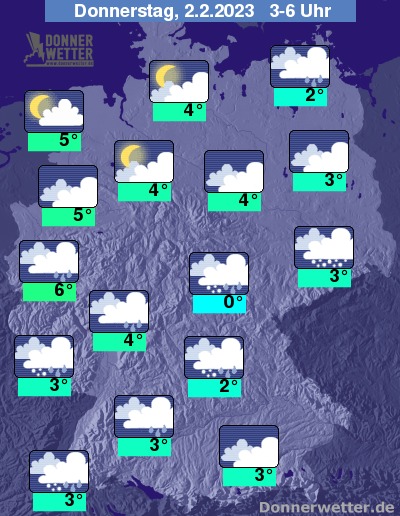 Am Donnerstag zeigen sich im Norden und Osten oft heitere Abschnitte, teils ziehen hier jedoch auch dichte Wolken durch, die vereinzelt Schauer mitbringen. Im übrigen Bundesgebiet ist es meist stark bewölkt und es fällt gebietsweise Regen, Schneeregen oder Schnee. Die Temperatur steigt auf 3 Grad in Erfurt und bis 7 Grad in Meppen. An der See weht ein oft stürmischer Wind.