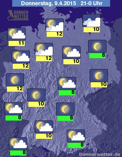 In der Nacht zum Freitag ist der Himmel über der Nordosthälfte des Landes meist sternenklar, zum Teil auch locker bewölkt, stellenweise bildet sich hier Nebel oder Hochnebel. In den anderen Landesteilen zieht meist lockere, gebietsweise auch aufgelockerte Bewölkung durch. Es bleibt landesweit trocken bei Tiefstwerten zwischen 9 Grad in Hannover und 4 Grad am Odenwald.