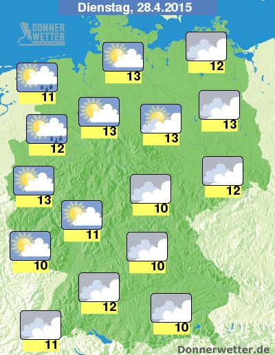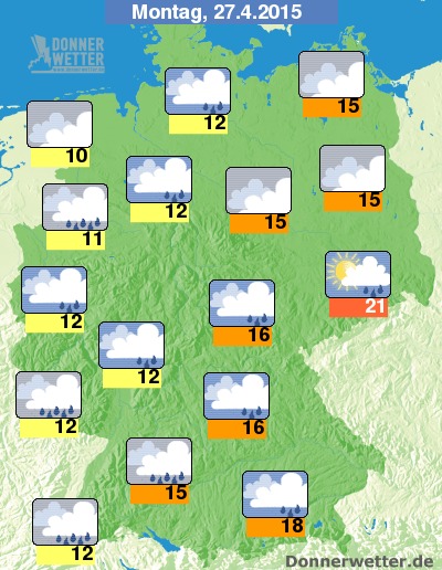 Der Start in die neue Wetterwoche fällt in Deutschland meist sehr durchwachsen aus, denn es ziehen verbreitet dichte Wolken übers Land, die immer wieder zu Regenfällen und auch teils kurzen Gewittern führen. Gegen Abend klingen die Niederschläge im Norden und Nordwesten weitgehend ab, Auflockerungen bleiben aber selten. Die Temperatur erreicht 10 bis 21 Grad.