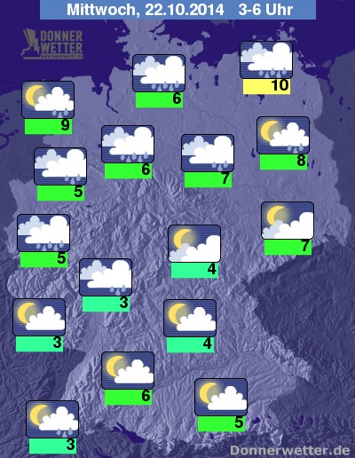 In der kommenden Nacht ziehen häufig dichte Wolken durch, dabei fällt zeitweise, gebietsweise längeranhaltender Regen. Dazu weht ein verbreitet starker und teils stürmischer Wind, auf den Bergen und an der Nordsee sind schwere Sturmböen, vereinzelt auch orkanartige Böen möglich. Die Schneefallgrenze sinkt vorübergehend bis auf etwa 700 Meter. Die Temperatur sinkt auf 10 Grad an der Ostsee und bis 3 Grad am Schwarzwald.