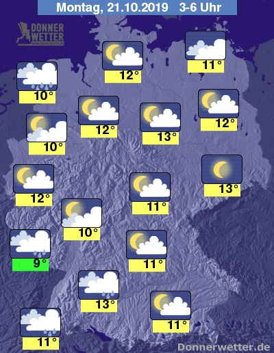 In der folgenden Nacht fällt in den westlichen und nördlichen Landesteilen noch zeitweise Regen, der bis zum Morgen größtenteils abklingt oder abschwächt. Am Morgen regnet es dann überwiegend noch im Nordseeumfeld und im Südwesten weiter. Im übrigen Bundesgebiet ist es meist locker bis aufgelockert bewölkt und trocken. Die Temperatur sinkt auf 13 Grad in Magdeburg und bis 9 Grad im Saargau.