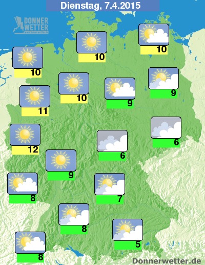 Am Dienstag ist es im Osten, aber auch im Südosten und Süden oft stark bewölkt, aber trocken, sonst ist es verbreitet heiter bis sonnig und ebenfalls trocken. Die Höchstwerte erreichen 6 bis 12 Grad.
