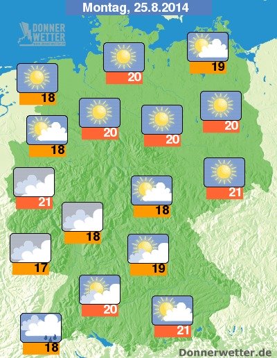 Der Dienstag wird in der Nordhälfte Deutschlands voraussichtlich weiterhin freundlich und trocken, weiter südlich ziehen jedoch verbreitet dichte Wolken auf und es fällt auch immer wieder teils kräftiger Regen. Bei anhaltendem Regen werden unter den dichten Wolken teilweise nur 13 Grad erreicht, in Hamburg steigt das Quecksilber etwa bis 22 Grad.