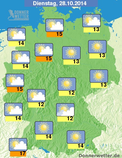 Bei Höchstwerten um 12 Grad C im Thüringer Wald und um 15 Grad C im Rheinland ist von Regen am Dienstag keine Spur.
