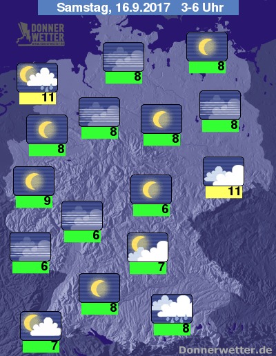 In der Nacht klart der Himmel über dem Land verbreitet auf. Ausnahme bleibt der Südosten der Republik, wo es die Nacht über meist bedeckt und regnerisch bleibt. Im Nordseeumfeld bringen dichte Wolken gebietsweise Schauer und auch mögliche Gewitter, sonst bleibt es trocken. Die Temperatur sinkt auf 11 Grad in Dresden und bis etwa 6 Grad am Taunus.