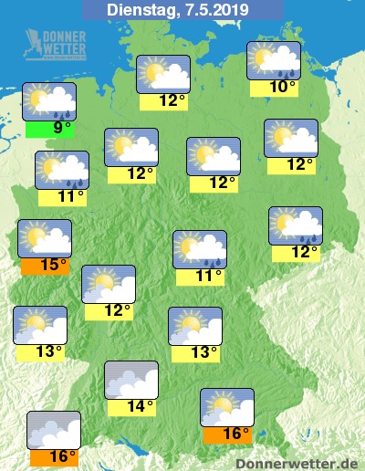 Die Höchsttemperaturen liegen allgemein zwischen 9 und 13 Grad. Im Süden und Westen können regional auch zwischen 14 und 17 Grad erreicht werden.