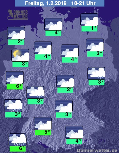 Am Abend bleibt der Himmel meist stark bewölkt oder bedeckt, im Südosten kann es stellenweise auch mal auflockern. Bis auf einzelne Schauer im Südwesten, die meist als Regen oder Schneeregen fallen, bleibt es überwiegend trocken.