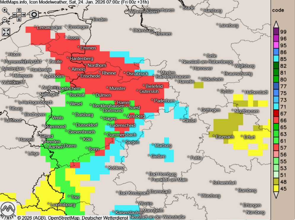 Durch gefrierenden Regen kann es am Samstagmorgen verbreitet zu spiegelglatten Straßen und Wegen kommen. Besonders betroffen sind Ostwestfalen-Lippe, das Münsterland, das Ruhrgebiet sowie südliche Teile Niedersachsens.