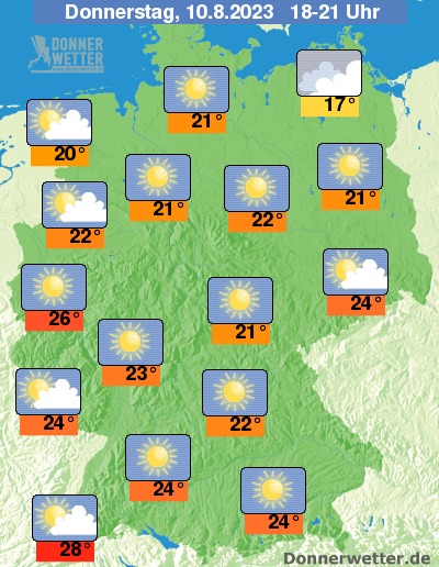 Heute Abend scheint über dem Land die Sonne von einem oft wolkenlosen oder nur gering bewölkten Himmel. Im äußersten Nordosten halten sich gebietsweise dichte Wolken, dazu bleibt es aber meist trocken. Im übrigen Land bleibt es komplett trocken bei Werten von 17 Grad in Rostock und bis 28 Grad in Freiburg.