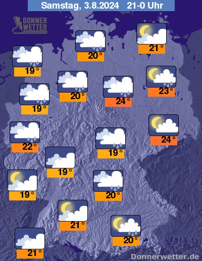 Am Samstagnachmittag zeigt sich der Himmel wechselnd, teils auch stark bewölkt, dabei muss zunächst vor allem im Süden und Westen mit Schauern und Gewittern gerechnet werden, im weiteren Verlauf nordostwärts ausbreitend. Östlich der Elbe bleibt es teils heiter, teils ist es sonnig und es ist meist trocken.