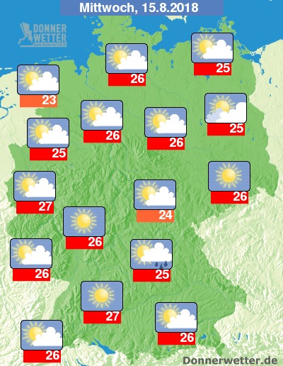 Am Mittwoch ist es über dem Land heiter bis wechselnd, nur hier und da auch mal stärker bewölkt, dabei bleibt es weitgehend trocken, nur im Süden sind vereinzelt Schauer möglich. Die Temperatur steigt auf 23 Grad im Nordseeumfeld und bis 27 Grad entlang des Rheins.